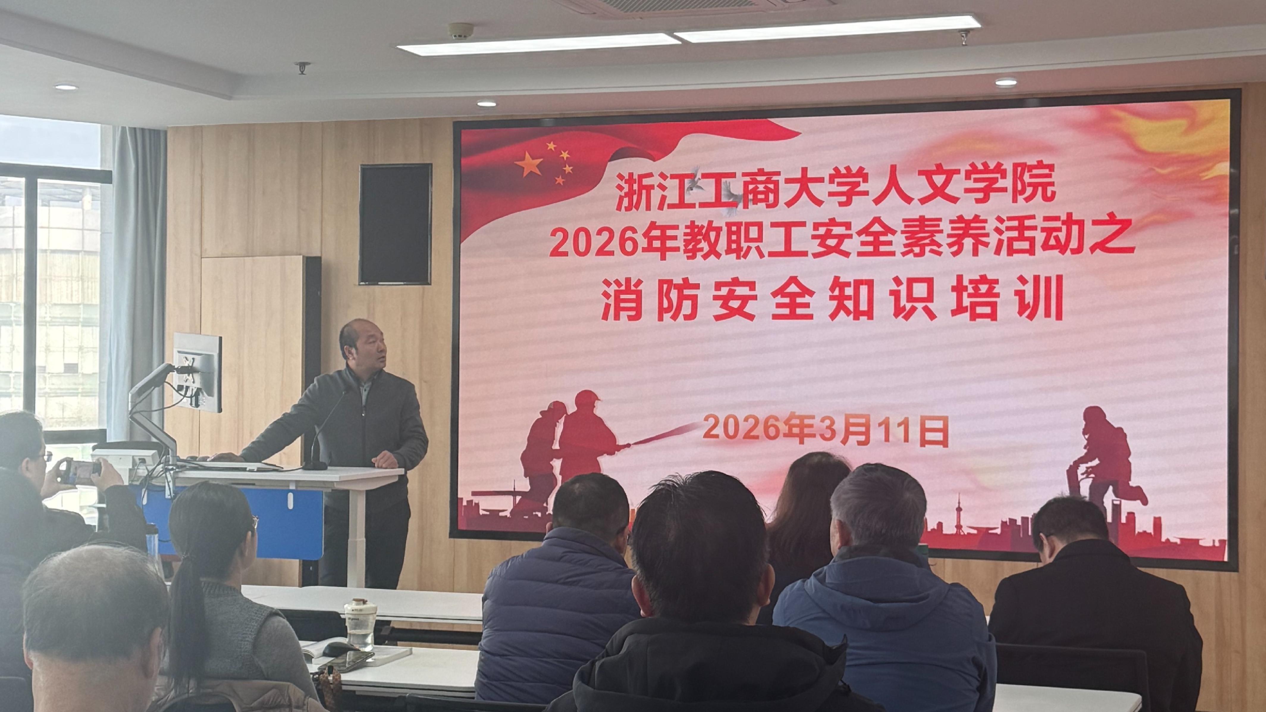 为切实加强校园消防安全管理,提升全院师生消防安全意识和应急处置能力,筑牢平安校园安全防线。2026年3月11日下午人文学院组织消防安全技能知识培训,重点讲解火灾逃生面罩使用及灭火器操作要点,提升师生应急处置能力。学校保卫处消防科主管刘善武老师主讲,学院院领导及教师代表共计50余人参加本次活动。