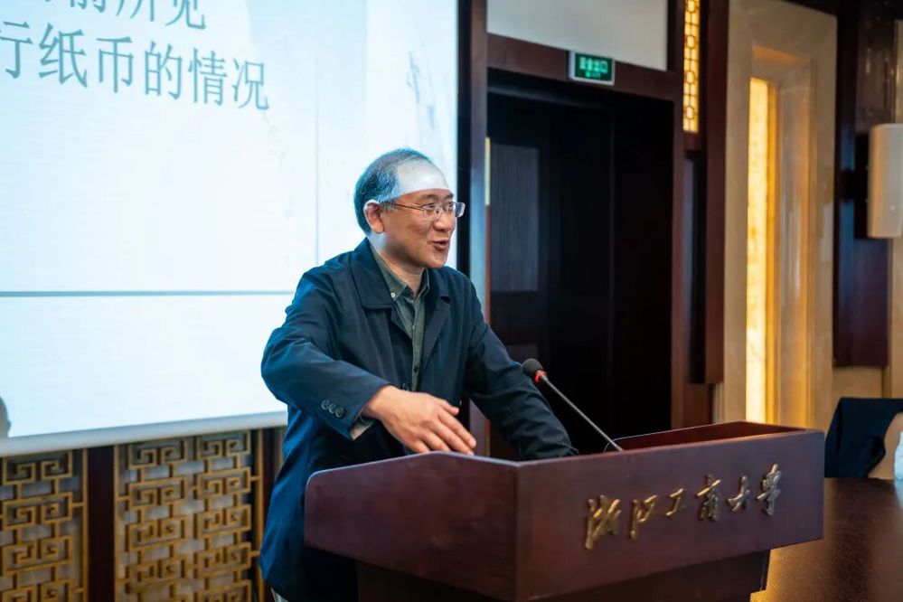 国务院特殊津贴专家、教育部高等学校教学指导委员会历史学类专委会副主任委员、中国史学会副会长戴建兵教授,以《纸币的诞生》为题,指出纸币的核心价值在于其作为流通手段的功能,其信用根基并非贵金属背书,而是广泛的社会接受度与国家治理能力。同时,他提出了关于发行交子1000周年纪念钞的建议,希望此建议能在会议结束后进一步推进。